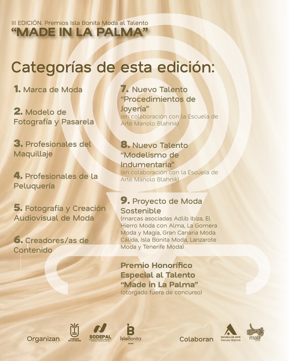 “Esta tercera edición supone un paso más en nuestro compromiso con el sector, ampliando oportunidades para la formación y el reconocimiento del nuevo talento. Apostar por nuestros diseñadores, creadores, artesanos y profesionales es apostar por el futuro de La Palma, por la generación de empleo y por el fortalecimiento de nuestra identidad como territorio creativo”, añade.